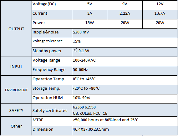 Outout Voltage: 5V 3A/9V 2.22A/12V 1.67A